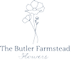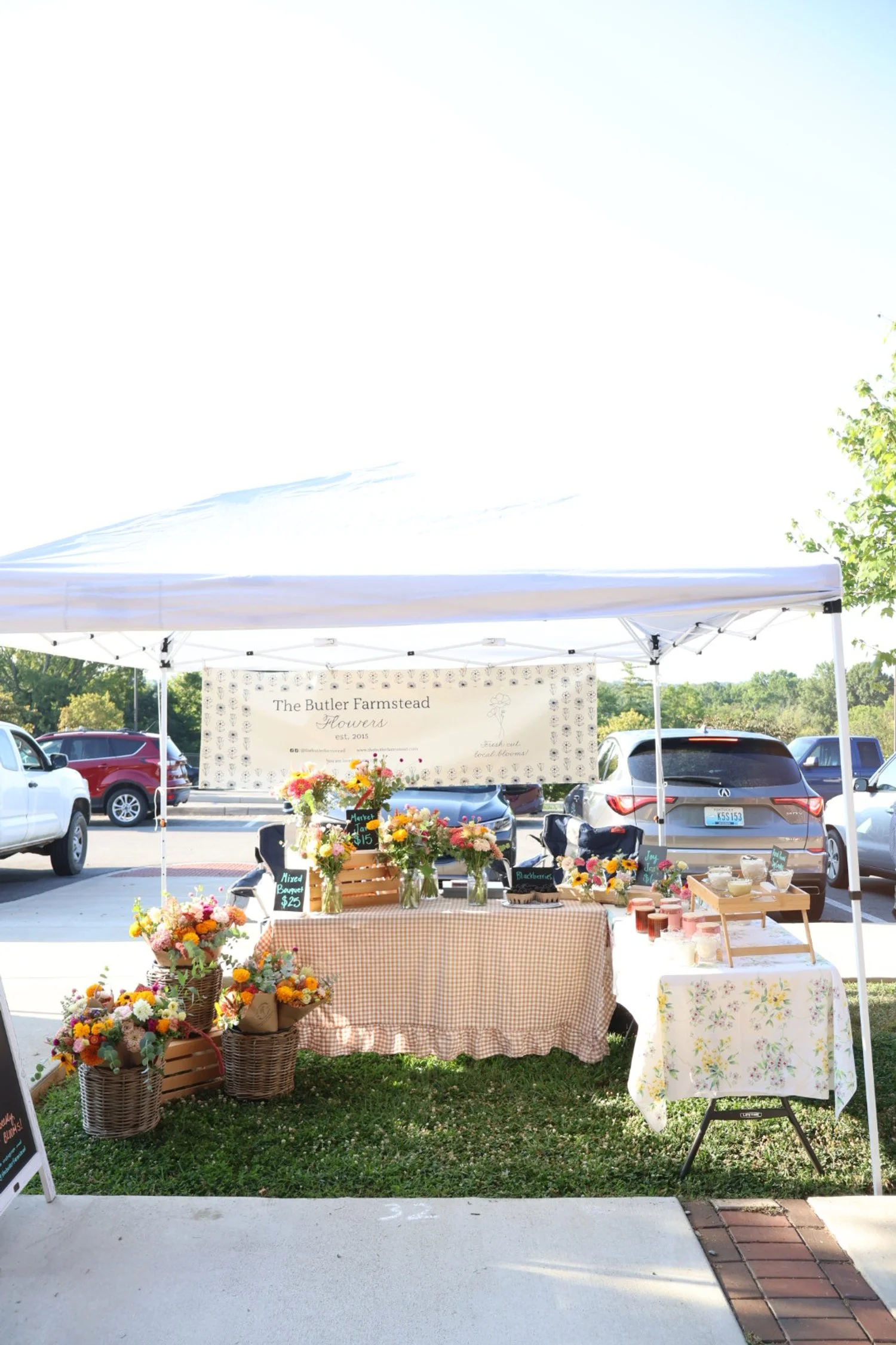 A flower stand of The Butler Farmstead with bouquets, jars, and candles for sale, set up under a white canopy at the La Grange Farmer's Market in Lagrange Kentucky.